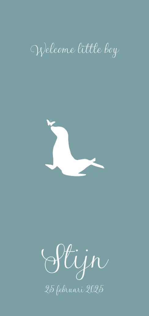 Wat een lief babykaartje voor een zoontje! Dit langwerpige geboortekaartje in petrol is geïllustreerd met een zeehond met vlinder op z'n neus die wordt gedrukt in glanzend goudfolie. Maak jij dit kaartje compleet met eigen teksten?