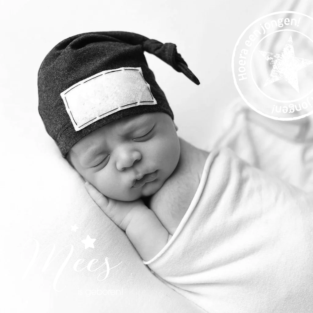 Dit vierkante babykaartje heeft een foto-achtergrond. Hiermee is jouw geboortekaartje echt persoonlijk! De tekst, sterretjes en het stoere stempel worden gedrukt in luxe goudfolie. Verder kun je deze hippe kaart naar wens maken in de online editor en eigen tekst toevoegen.