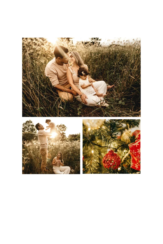 Kerstkaart om zelf te ontwerpen. Op deze dubbele staande kaart staan drie foto's en de tekst is in goudfolie. In de online editor kan alles naar wens worden aangepast.