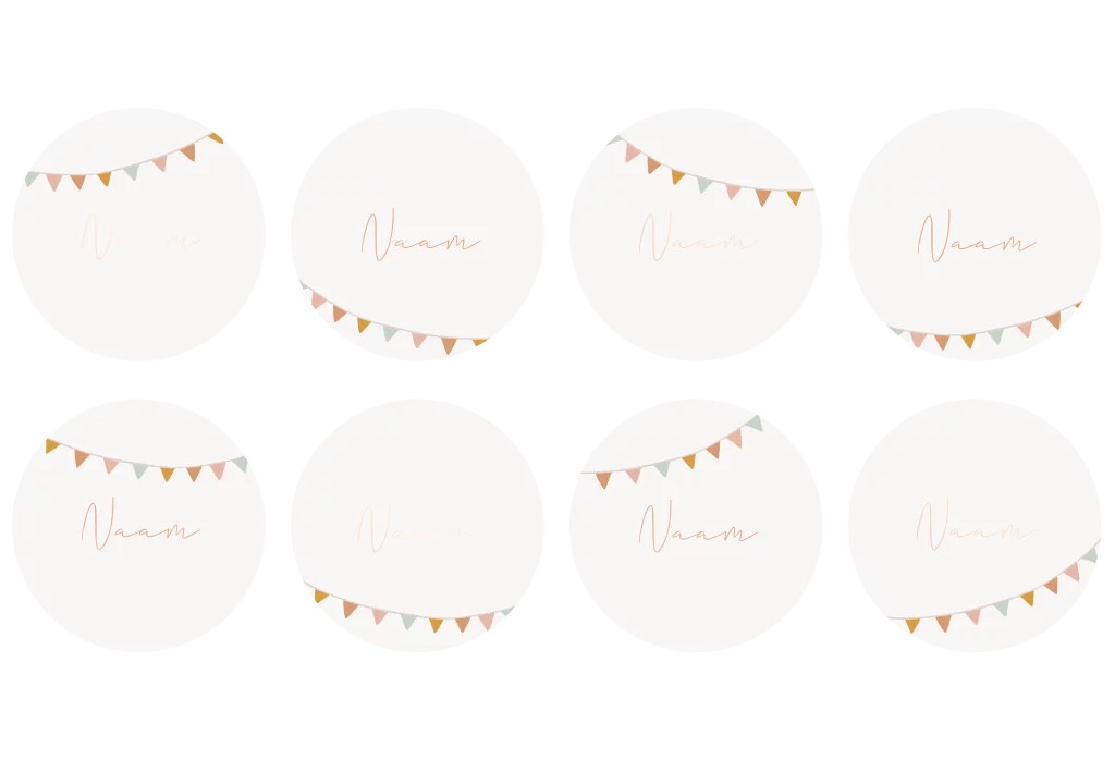 Ronde naamkaartjes Ø 10 cm - 8 stuks met vrolijke slingers en de tekst in goudfolie gedrukt. Passend bij de originele uitnodiging voor je 21 diner.