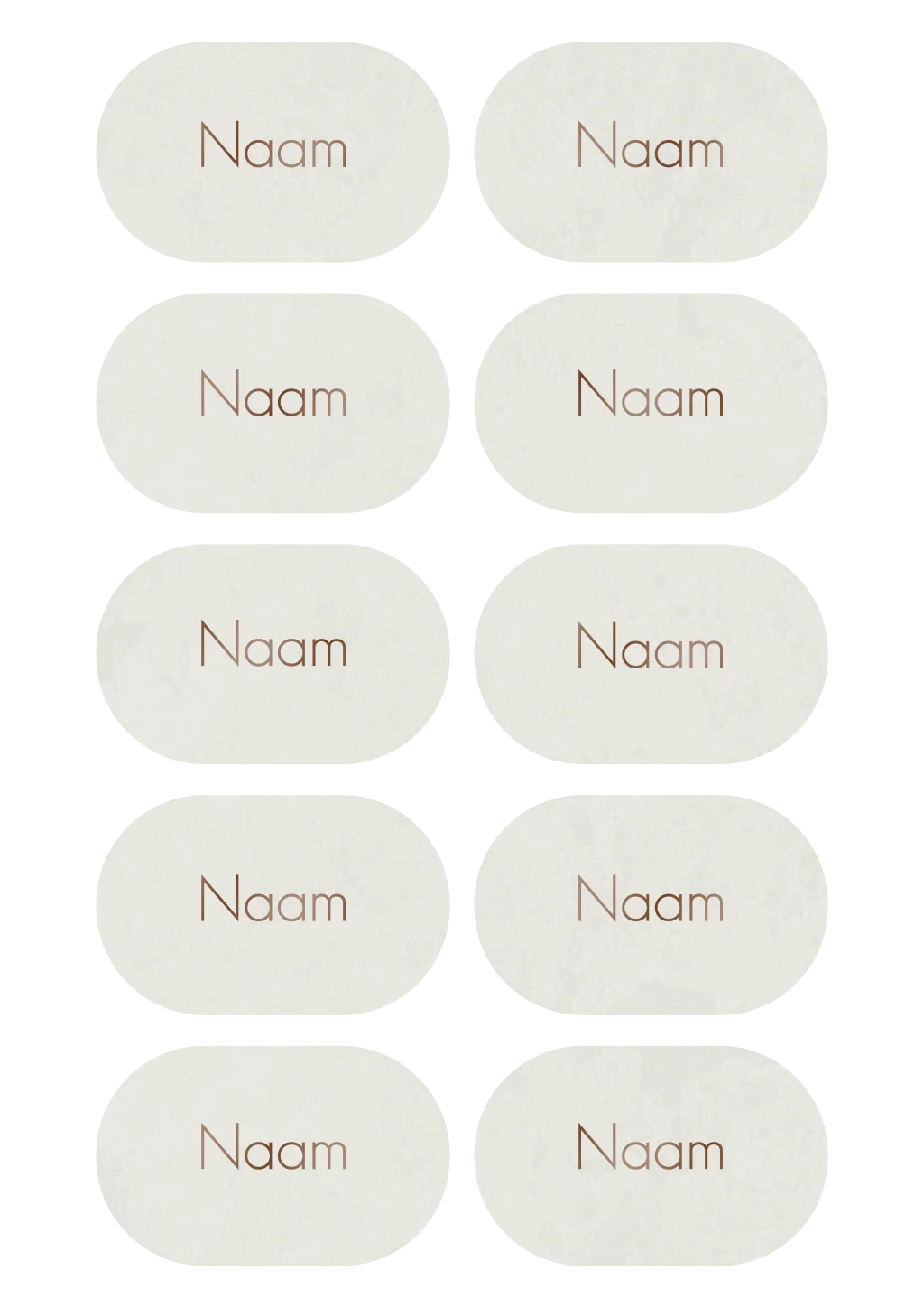 Ovale naamkaartjes in de stijl van de trouwkaart. Op de grijze achtergrond staan de namen in hoogglans.