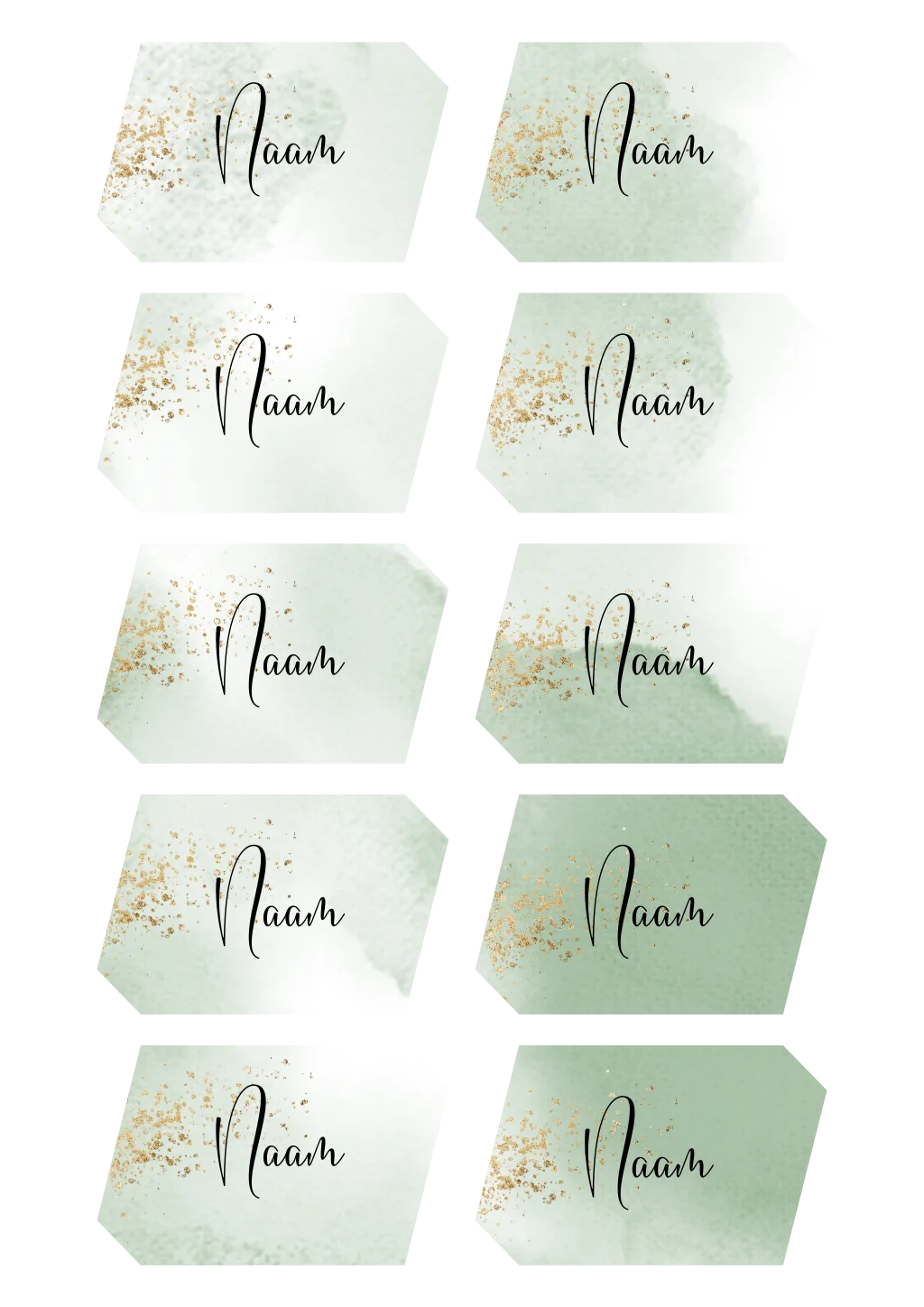 Zeshoekige naamkaartjes in groen en gouden spetters