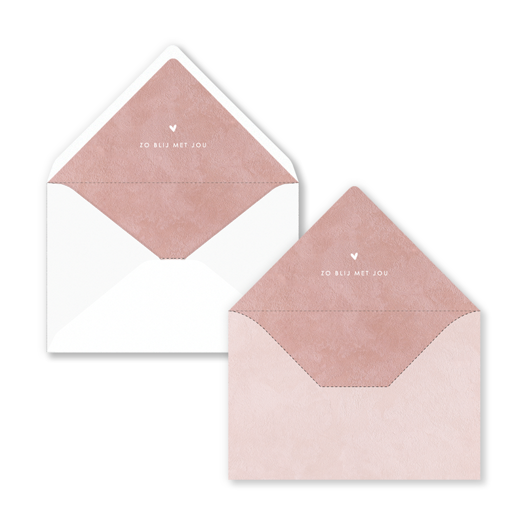Mooie bijpassende envelop bij het lieve geboortekaartje in roze velvetlook met een klein wit hartje. Je schuift de inlay gemakkelijk in de envelop en vervolgens steek je het geboortekaartje erbij in. Deze inlay is niet geschikt voor de volgende enveloppen in het formaat 22x11: eco-tulp, berry, biotop, metallic brons, donkergrijs.