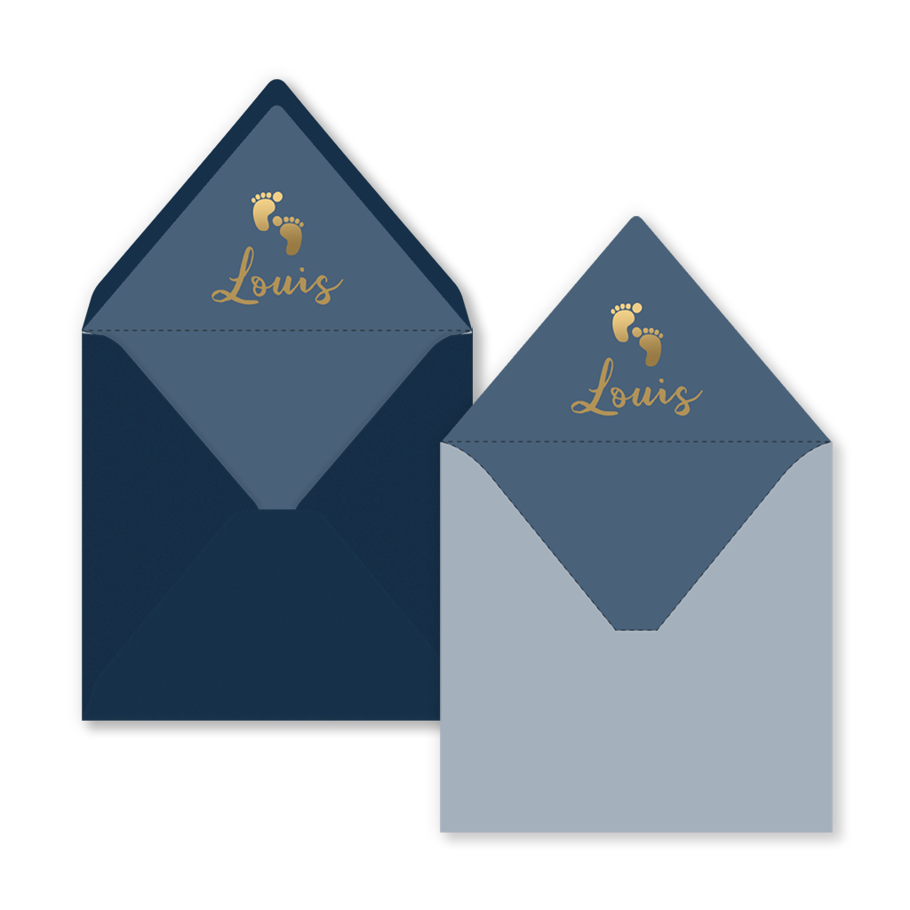 Bijpassende envelop-inlay bij het donkerblauwe geboortekaartje voor een jongen met de lieve illustratie van voetjes in goudlook. Schuif de inlay in de envelop en vervolgens voeg je het geboortekaartje ook toe aan de envelop. Deze inlay is niet geschikt voor de volgende enveloppen in het formaat 22x11: eco-tulp, berry, biotop, metallic brons, donkergrijs.