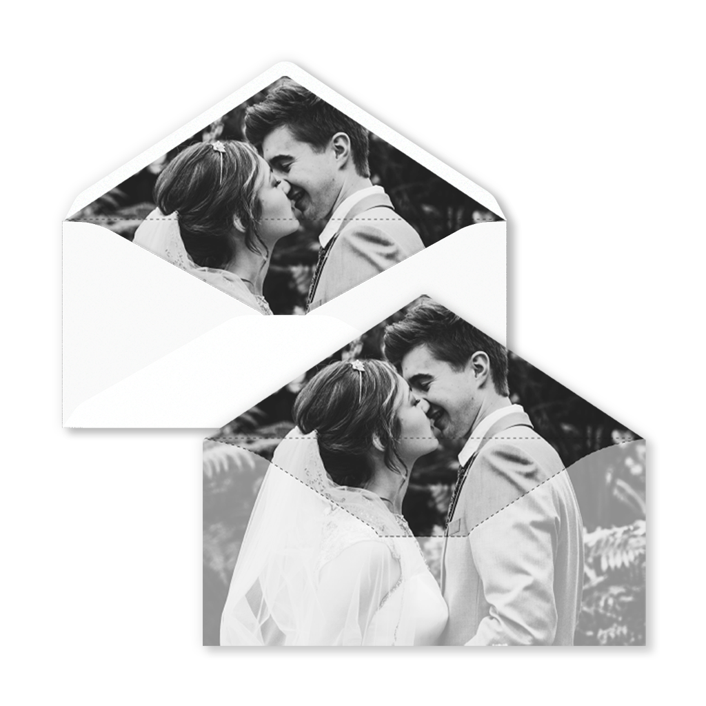 Open, laat je verrassen en sta versteld! Wij bieden envelopinzetstukken voor de volgende envelopformaten: 12x18, 14x14 en 22x11. Op verzoek kunnen we dit ontwerp wijzigen in een ander formaat of een inzetstuk maken in de stijl van uw trouwkaart.