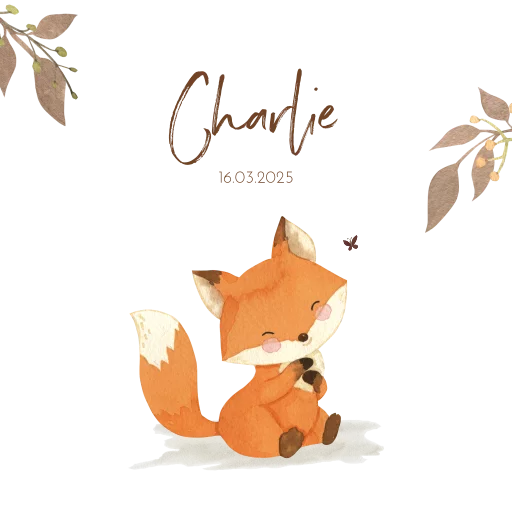 Mooi bijpassend aankondigingsbord voor de geboorte van jullie kleintje. De naam staat tussen twee takjes in een losjes geschreven letter. Eronder een lief zittend vosje in roodbruin en wit, erboven fladdert een klein vlindertje.