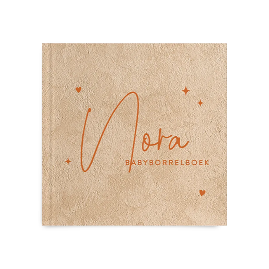 Hou je niet van een druk design dan past dit babyborrelboek perfect! Op de beige achtergrond in velvetlook staat de naam in oranje sierlijk handschrift, hier en daar een lief hartje en sterretje om het af te maken.