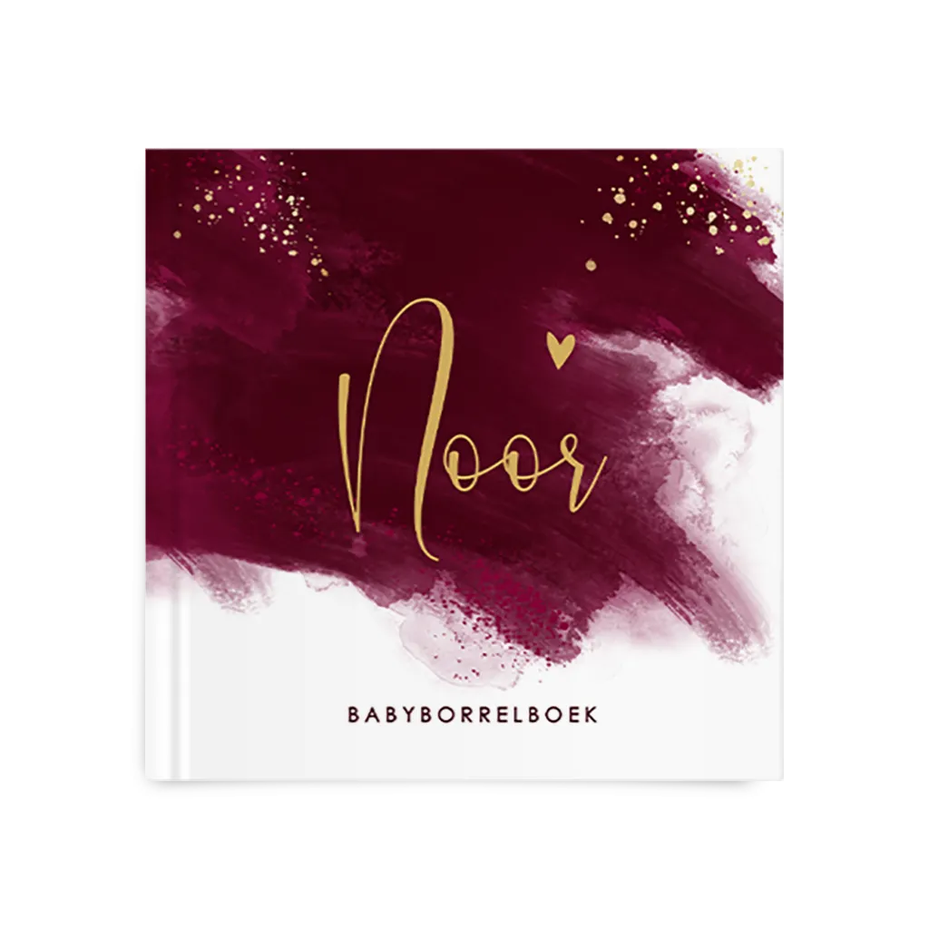 Mooi babyborrelboek in dezelfde stijl als het geboortekaartje: chique donkerrode aquarel met wit en goudkleurige tekst. De spetters en het hartje in goudkleur maken het helemaal af! Specificaties van het babyborrelboek