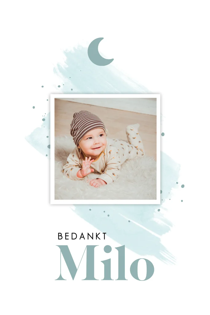 Bedankkaartje geboorte staand model met afgeronde hoeken. Witte kaart met foto met op de achtergrond blauwe verfstrepen in aquarel en een blauw maantje.
