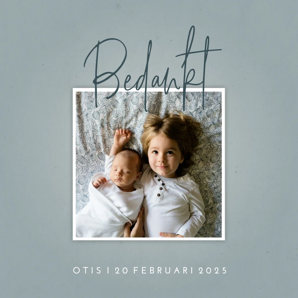 Bedankkaart geboorte vierkant met afgeronde hoeken. De foto in polaroid stijl komt mooi uit op de blauwgrijze achtergrond. Met trendy typografie maak je dit kaartje helemaal af! Pas het ontwerp eenvoudig naar eigen wens aan in de online editor.