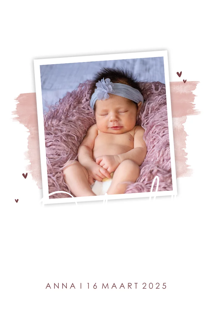 Lief bedankkaartje geboorte van een dochter. De foto in polaroid-stijl staat op een roze waterverfstreep. De kleine hartjes en de tekst in roségoudfolie maken dit kaartje helemaal af.
