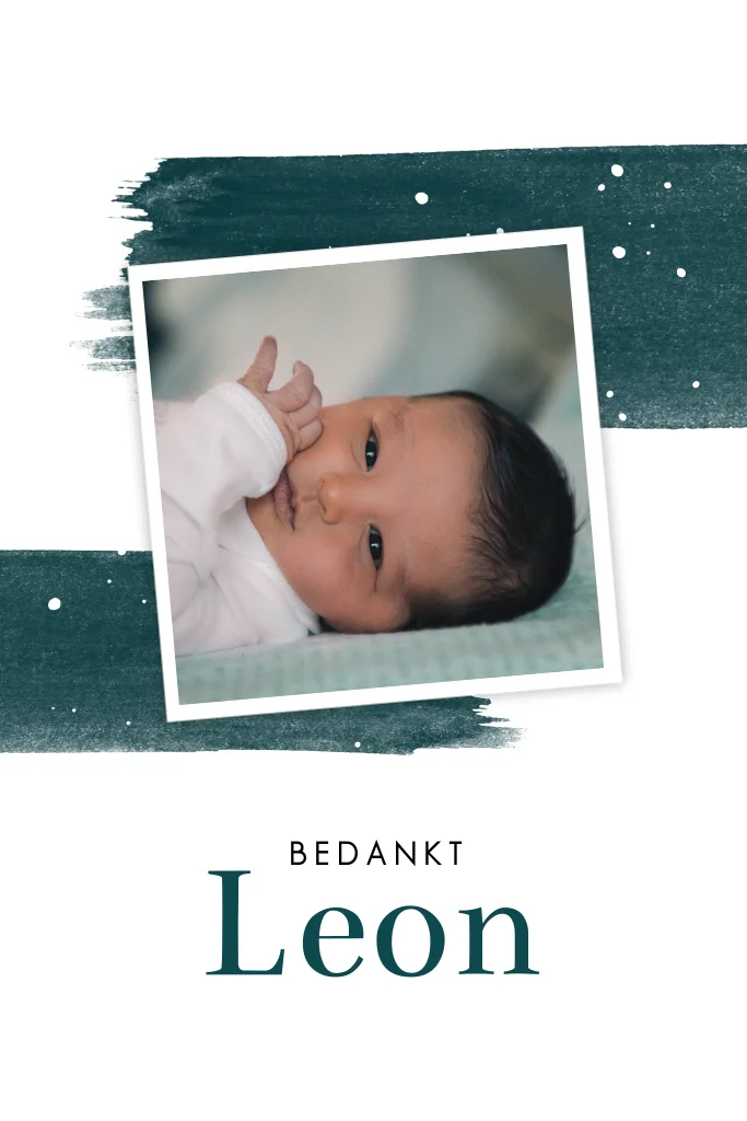 Bedankkaart geboorte staand model met afgeronde hoeken. Witte kaart met foto in polaroid stijl op een achtergrond van donkerblauwe verfstrepen. Met een modern lettertype maak je de kaart helemaal trendy. Het ontwerp is eenvoudig aan te passen in de online editor.