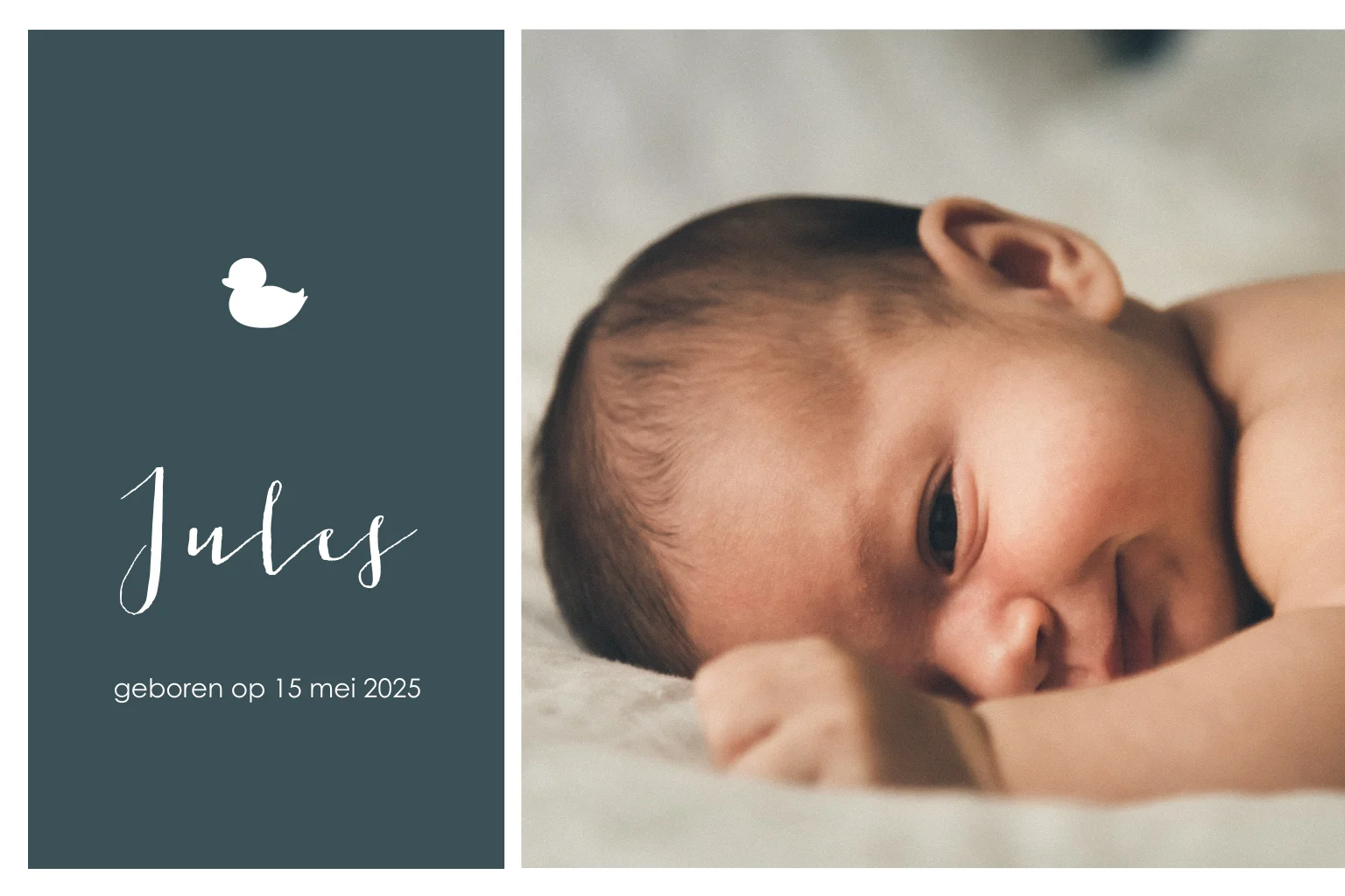 Bedankkaartje geboorte liggend model. Wit kaartje met kleurvlak met silhouet van een eendje en daarnaast ruimte voor eigen foto.