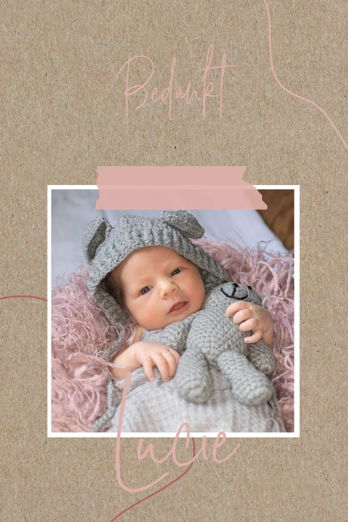 Mooie bedankkaart in kraft-look met roze lijnen en foto
