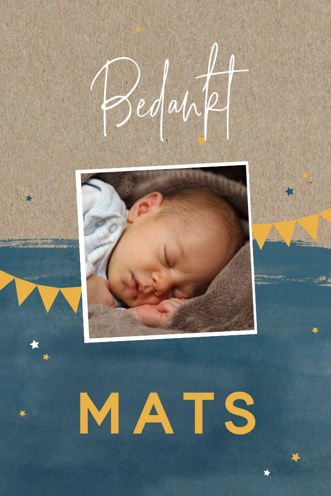 Bedankkaart geboorte staand model met foto. Stoere bedankkaart in kraft-look met petrolblauwe aquarel verf onderaan en feestslinger achter de foto.