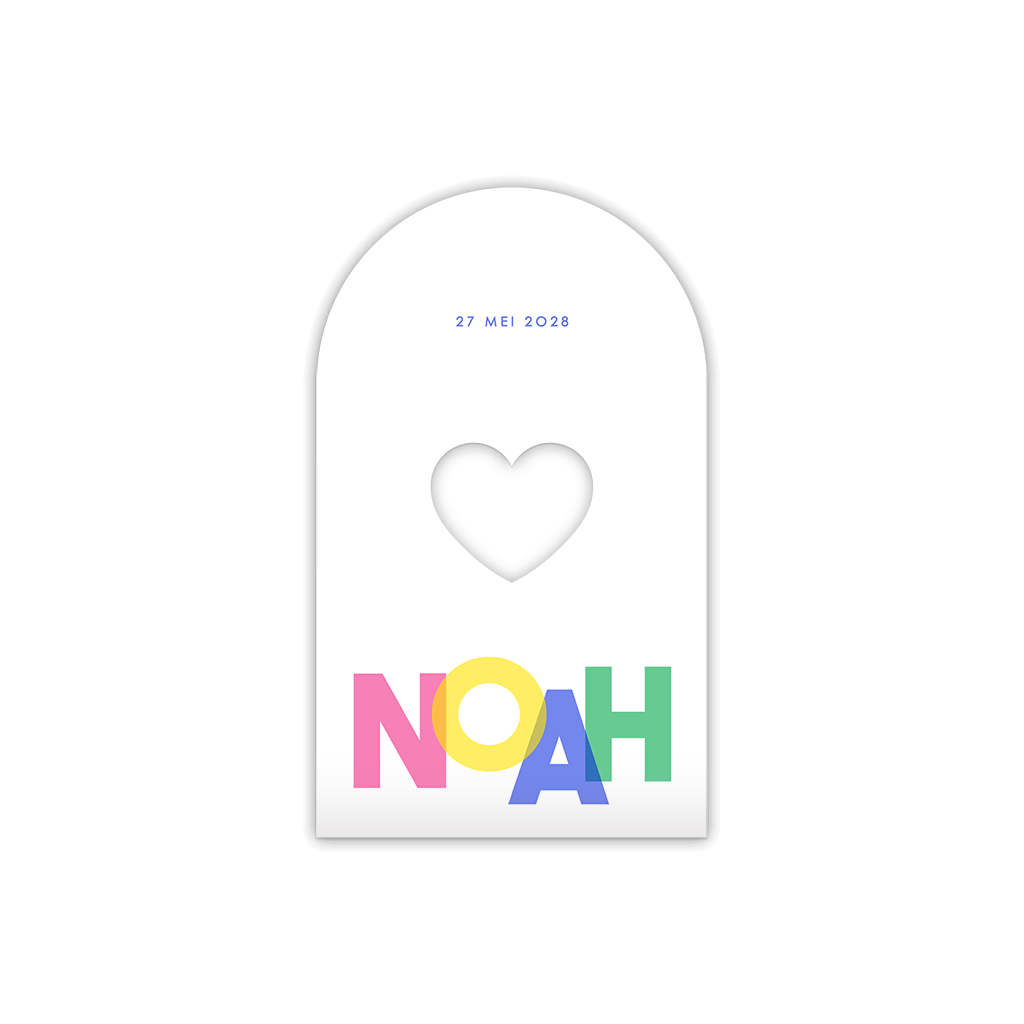 Boogkaartje met kleurrijke letters en uitsneden van een hartje. Het hartje geeft een leuk doorkijkje naar de doopsuiker die je erin stopt.