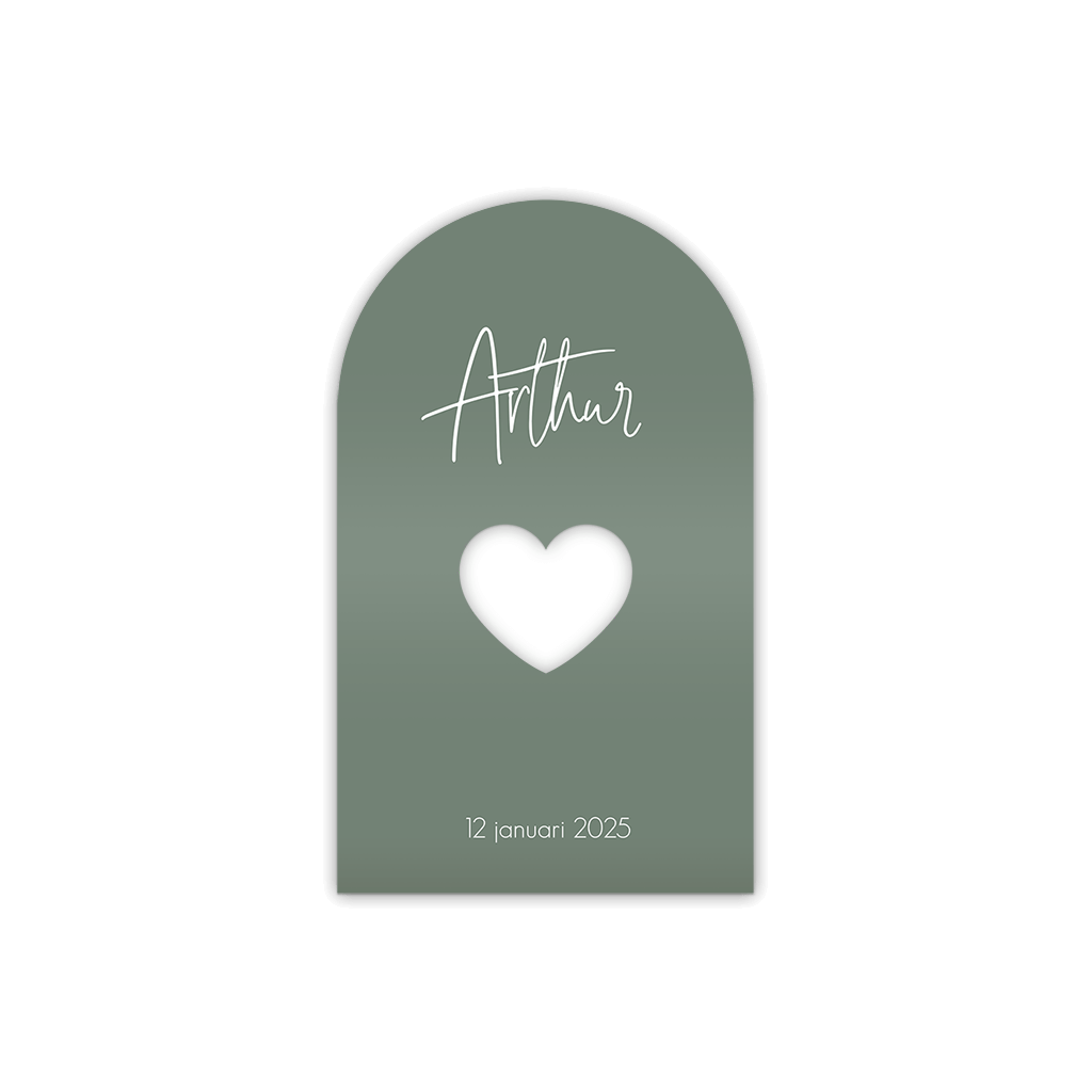 Boogkaartje met een uitgesneden hartje en de naam van jullie kleintje in sierlijke tekst. Door het hartje krijg je een leuk doorkijkje naar het cadeautje wat je er tussen stopt.