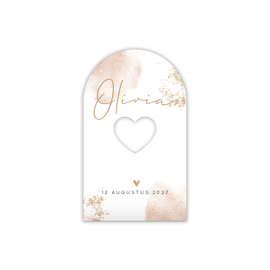 Boogkaartje met watercolour en gouden spetters. Het boogkaartje heeft een uitgesneden hartje die een doorkijkje geeft.| Totaalprijs: 0 |