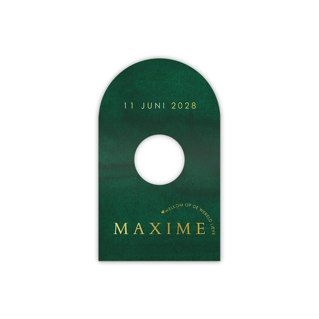 Boogkaartje met groene achtergrond en goudfolie tekst. Het kijkje heeft een rond doorkijkje waardoor je de doopsuiker goed kan zien| Totaalprijs: 0 |