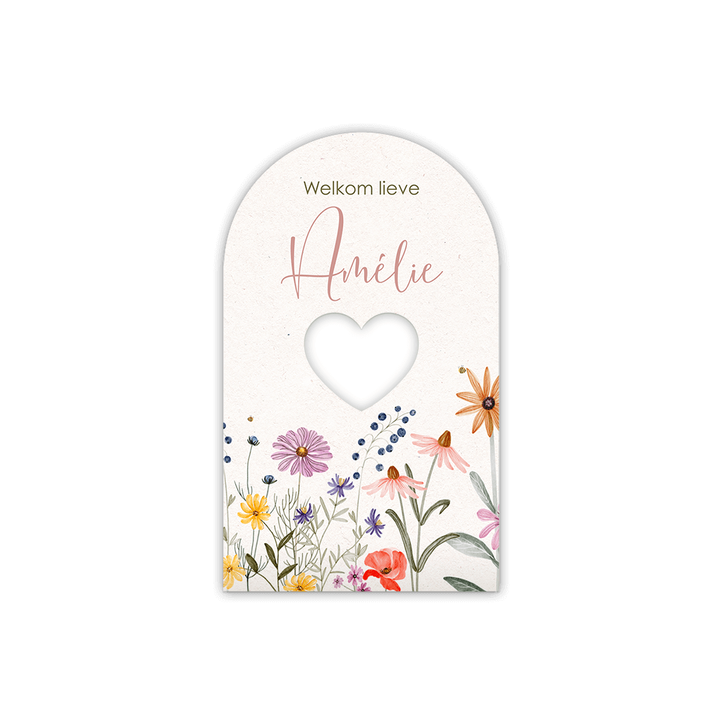 Boogkaartje met zomerse bloemen en uitsneden van een hartje