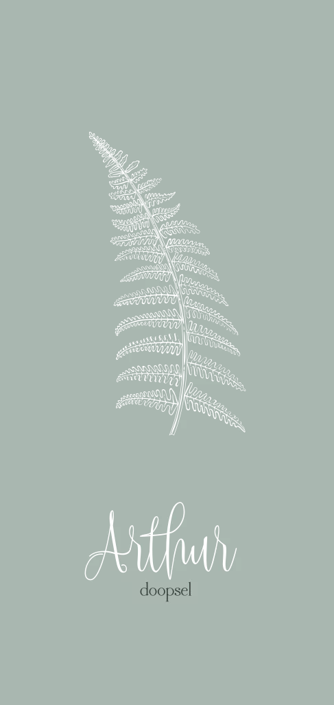 Elegant doopkaartje met een varentak in zilverfolie en een groene achtergrond.