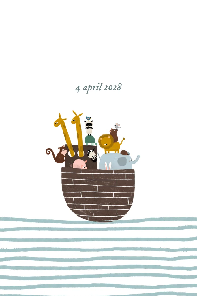 Een hip en modern doopkaartje met de Ark van Noach en alle dieren op een blauwe zee. De illustraties en de goudfolie geven het kaartje een unieke en lieve uitstraling.