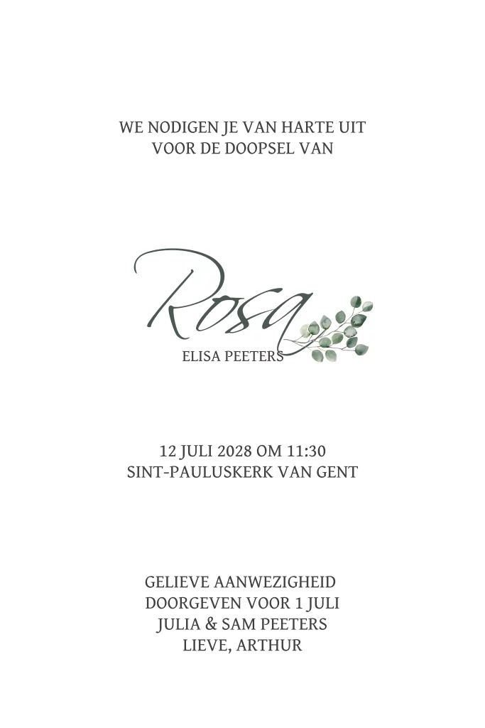 Minimalistische doopkaart met eucalyptusblaadjes.