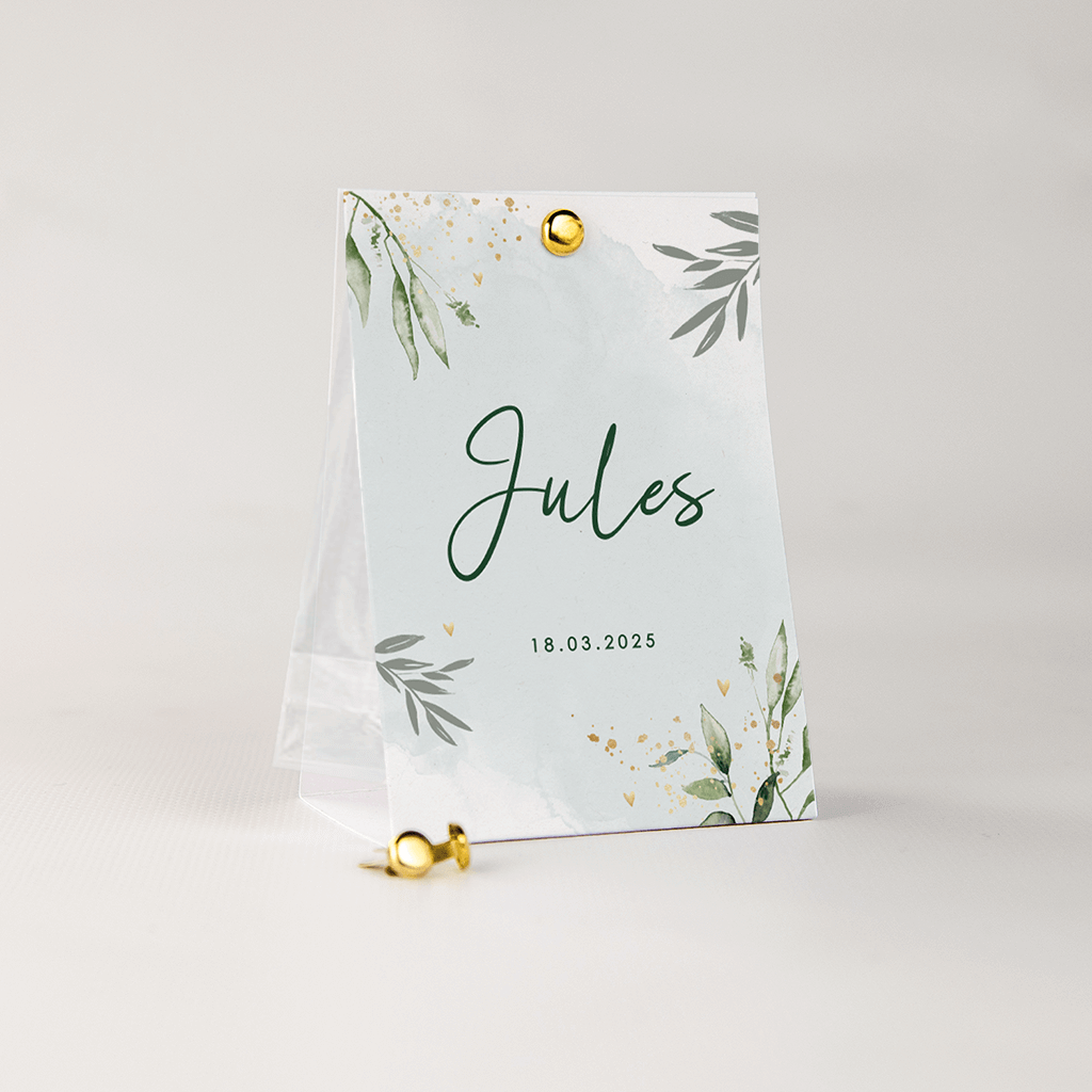Doopsuiker tentkaartje met eucalyptus bladeren en eigen foto