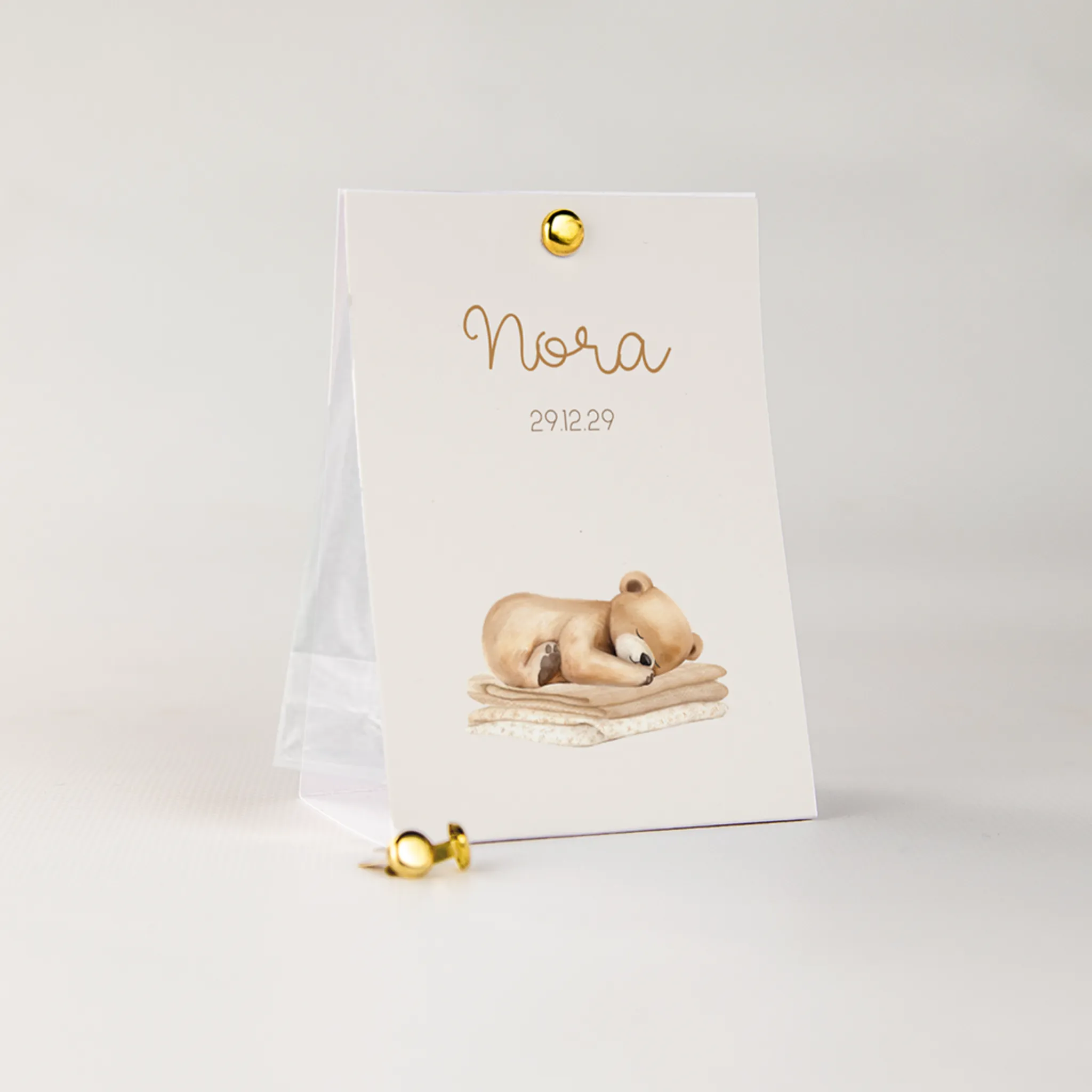 Een lief doopsuiker tentkaartje voor een meisje. Het kaartje heeft een mooie zachte kleur en op de voorgrond staat de illustratie van een slapende beer op een stapel dekens. Past helemaal bij het geboortekaartje, zodat je een volledige set hebt.
