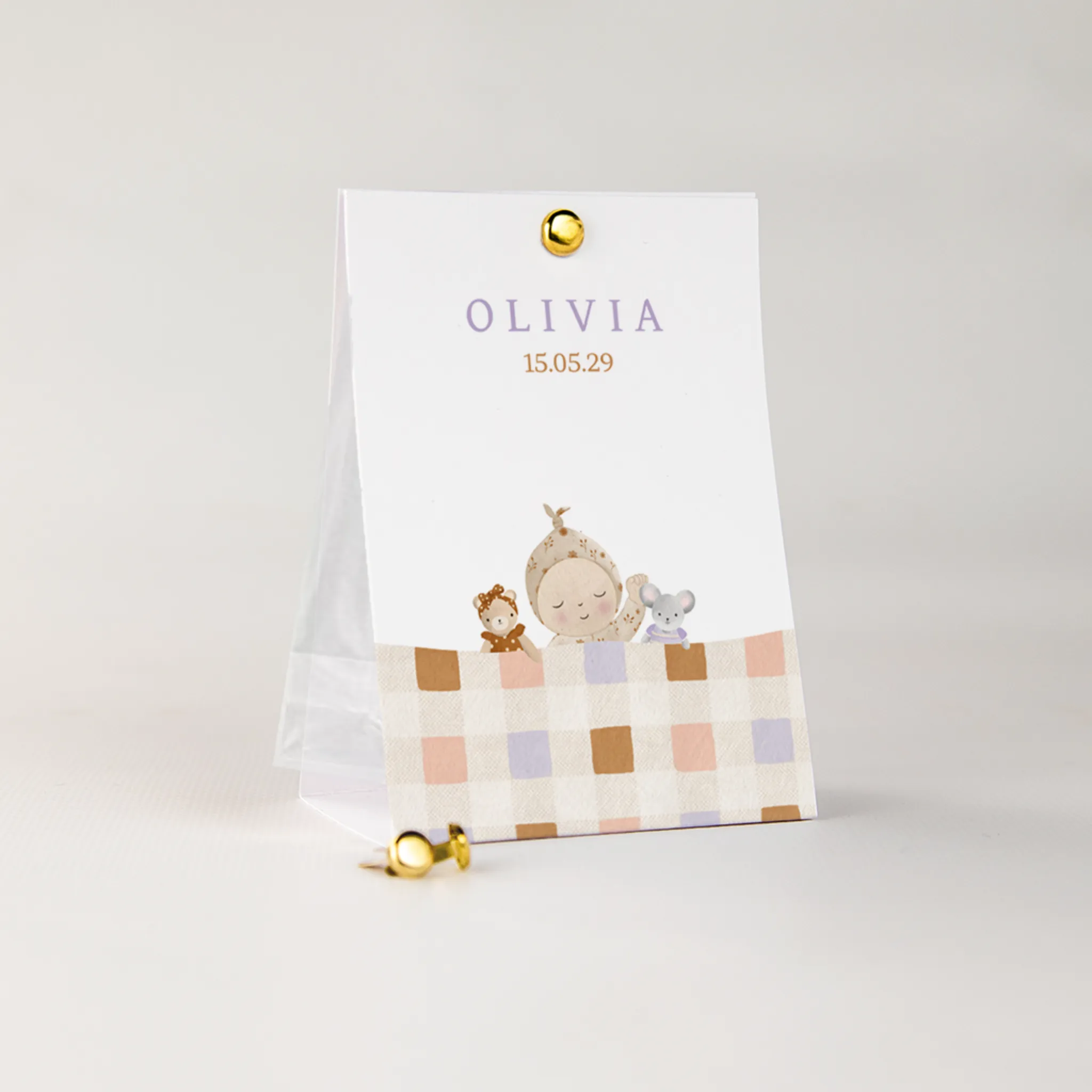 Doopsuiker tentkaartje met een witte achtergrond met daarop de illustraties van een baby die ligt te slapen onder een blokjesdeken. Past helemaal bij het geboortekaartje, zodat je een volledige set hebt.