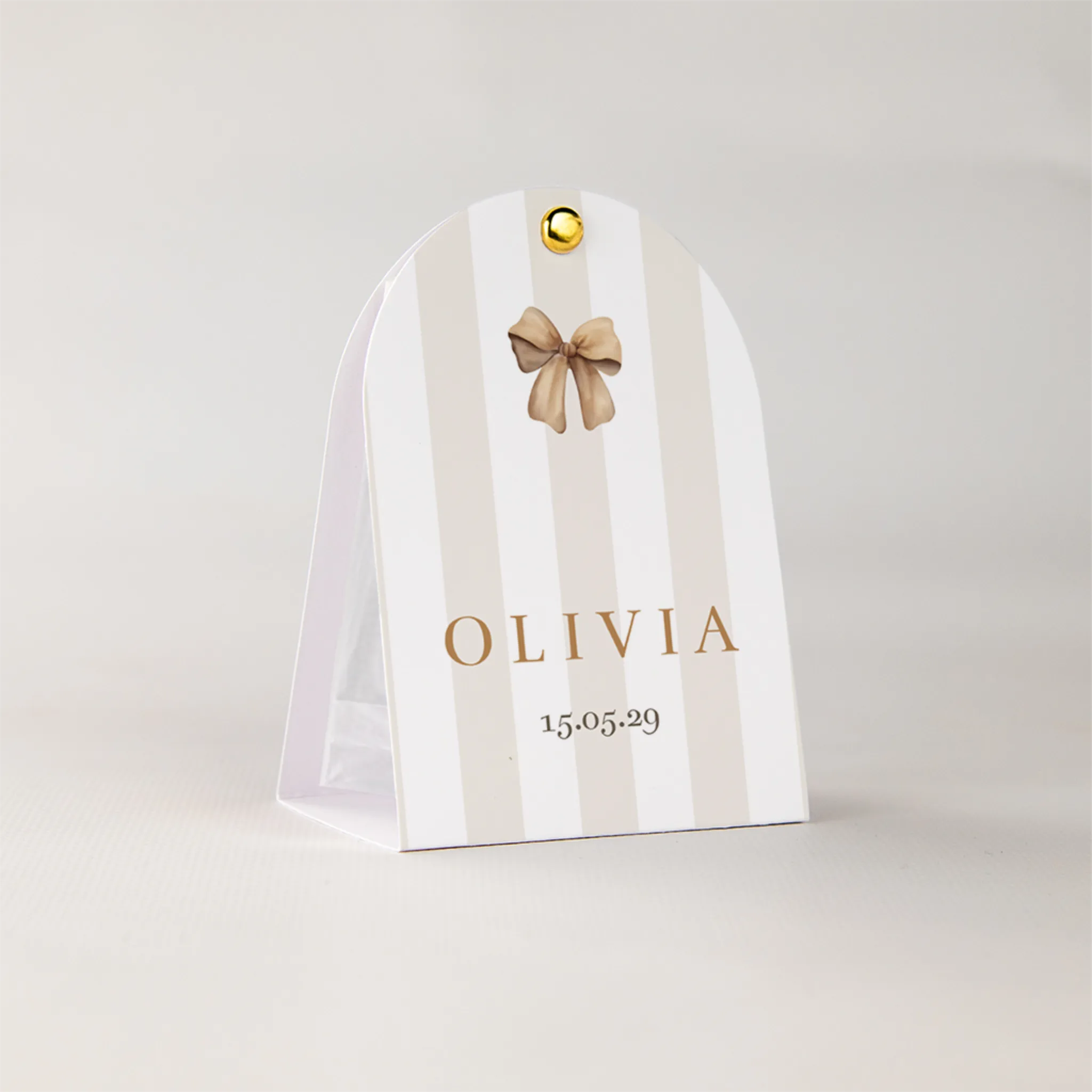 Klassiek doopsuiker tentkaartje met strepen in wit en beige en mooie strik. Past helemaal bij het geboortekaartje, zodat je een volledige set hebt.