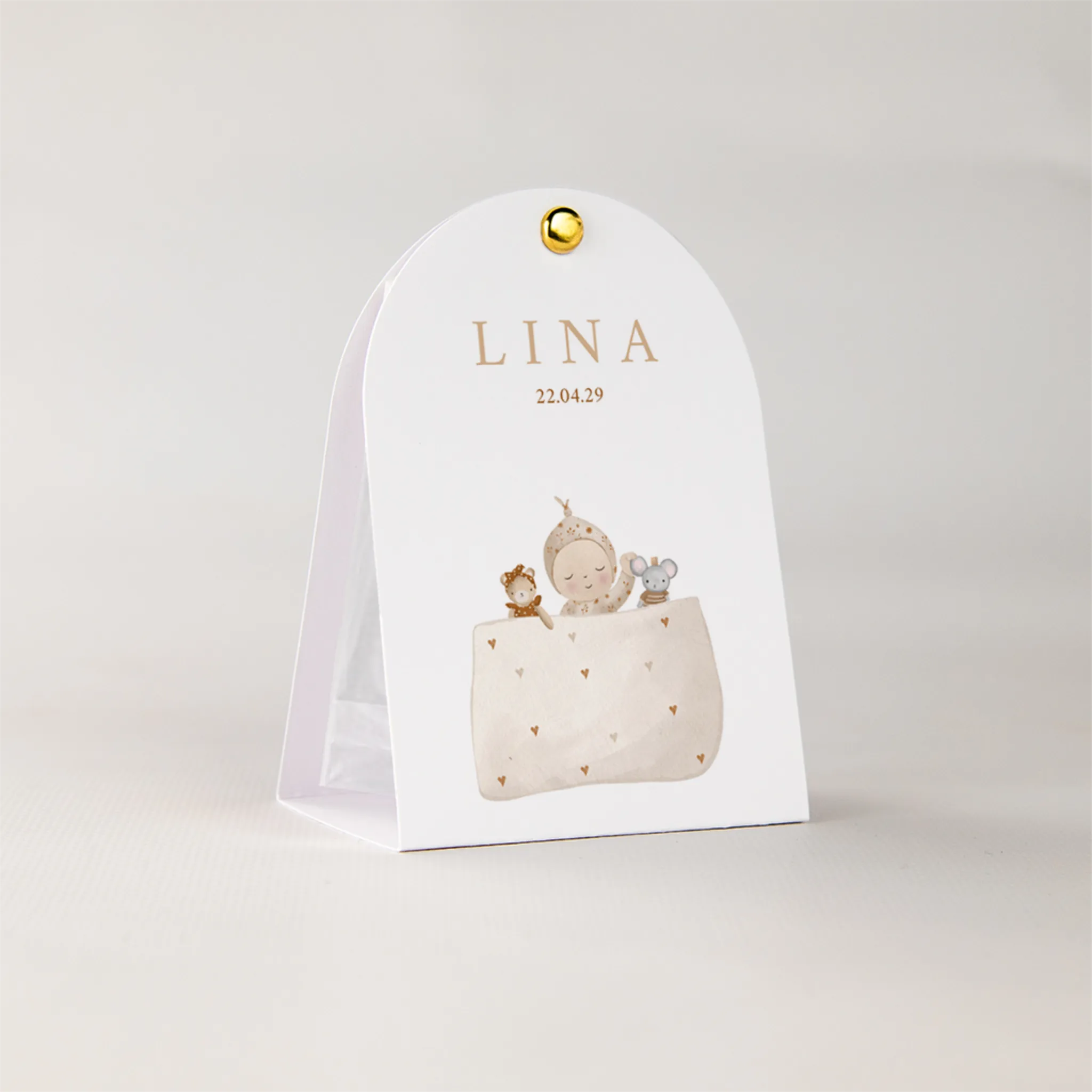 Een doopsuiker tentkaartje om bij weg te dromen. Op het kaartje staat een illustratie van een baby die ligt te slapen onder een hartjesdeken. Past helemaal bij het geboortekaartje, zodat je een volledige set hebt.