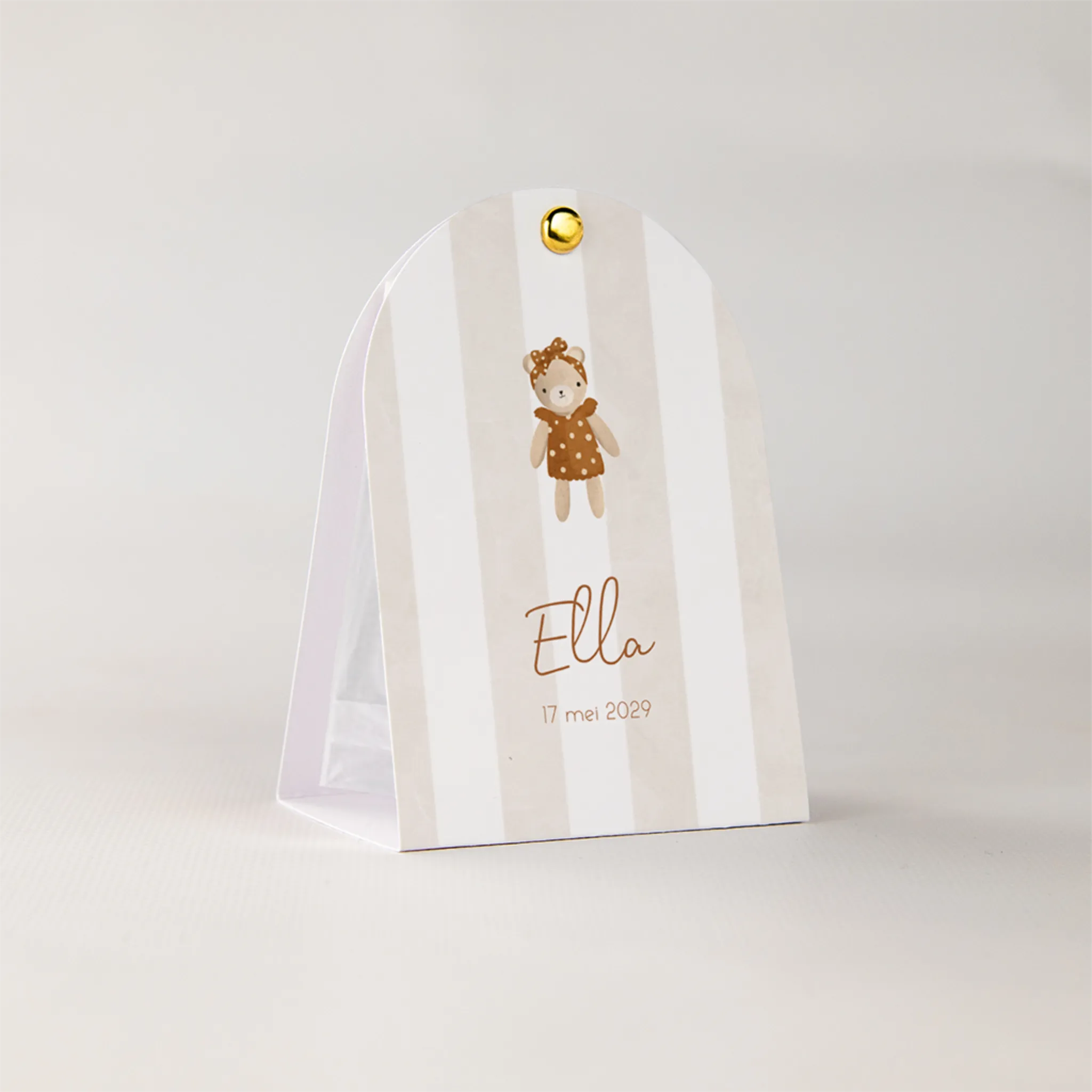 Een lief doopsuiker tentkaartje voor een meisje. Op het kaartje staan strepen in zachte kleuren met daarop een illustratie van een knuffelbeer. Past helemaal bij het geboortekaartje, zodat je een volledige set hebt.