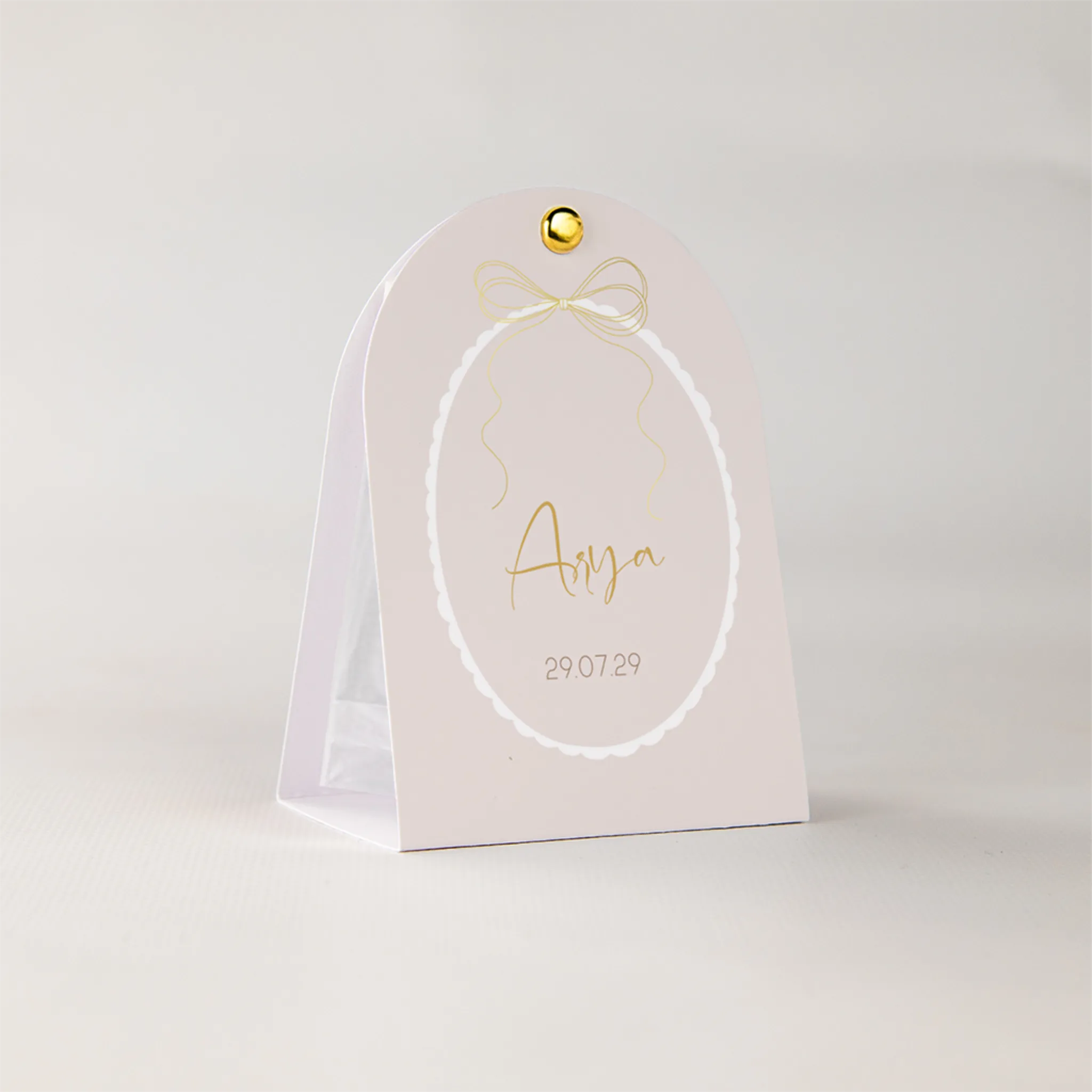 Stijlvol doopsuiker tentkaartje met zacht beige achtergrond en een strik in goudfolie voor een luxe finish. Past helemaal bij het geboortekaartje, zodat je een volledige set hebt.