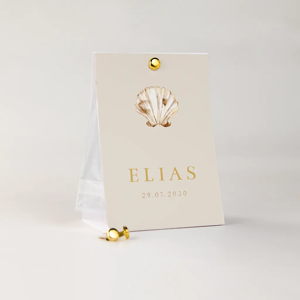 Zo stijlvol, dit tentkaartje voor de doopsuikers. Het kaartje heeft een mooie beige kleur. Op het kaartje staat een afbeelding van een schelp. Past helemaal bij het geboortekaartje, zodat je een volledige set hebt.