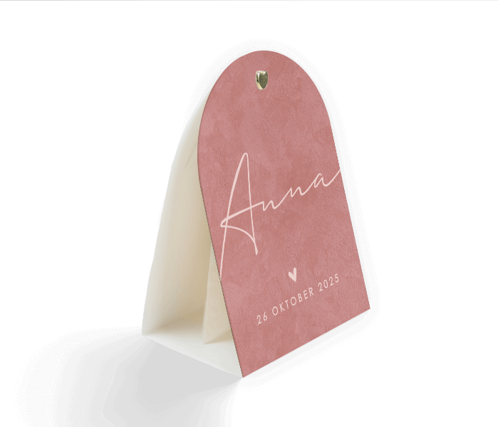 Bijpassend snoepzakje voor de doopsuikers in boogvorm in roze velvet-look en sierlijke letters in wit.