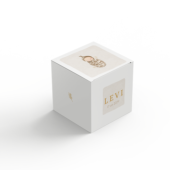 Een leuk doosje voor de doopsuikers in wit met beige met daarop een illustratie van een slapende baby in een omslagdoek. Het doosje is te bestellen in 2 formaten. We hebben een klein formaat, deze is 5 cm hoog breed en diep. Het grote formaat is 7 cm hoog, breed en diep. Allebei de formaten doosjes worden ongevouwen geleverd. De levertijd van de doosjes zijn 4 werkdagen.