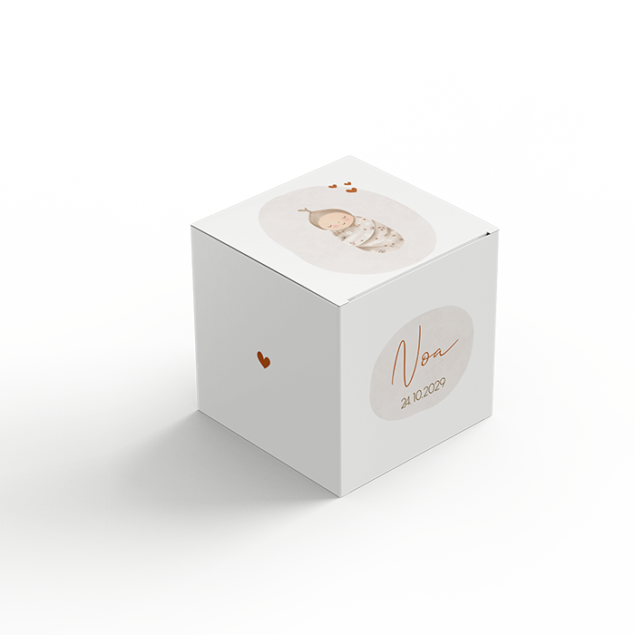 Een leuk doosje voor de doopsuikers in wit met roze met daarop een illustratie van een slapende baby in een omslagdoek. Het doosje is te bestellen in 2 formaten. We hebben een klein formaat, deze is 5 cm hoog breed en diep. Het grote formaat is 7 cm hoog, breed en diep. Allebei de formaten doosjes worden ongevouwen geleverd. De levertijd van de doosjes zijn 4 werkdagen.| Totaalprijs: 0 |