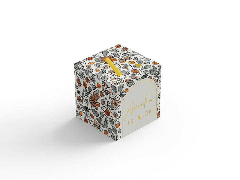 Het doosje is te bestellen in 2 formaten. We hebben een klein formaat, deze is 5 cm hoog breed en diep. Het grote formaat is 7 cm hoog, breed en diep. Allebei de formaten doosjes worden ongevouwen geleverd. De levertijd van de doosjes zijn 4 werkdagen.