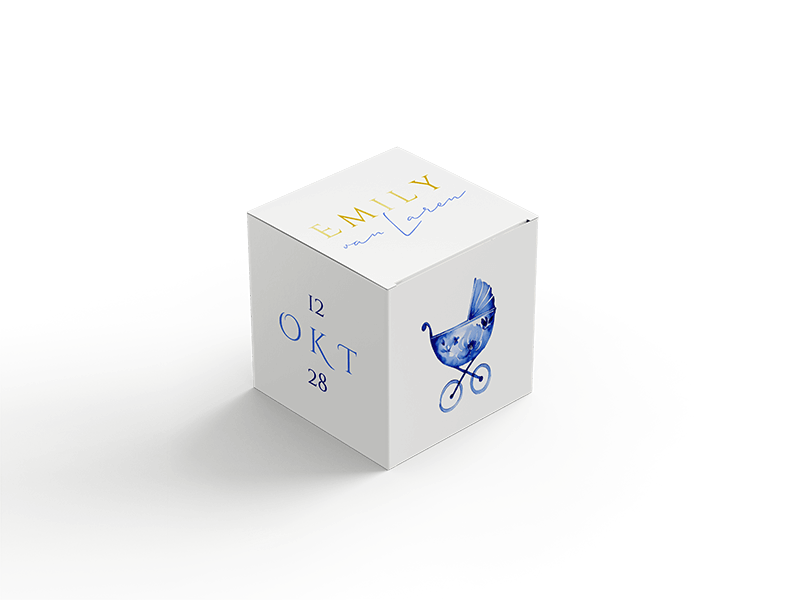 Het doosje is te bestellen in 2 formaten. We hebben een klein formaat, deze is 5 cm hoog breed en diep. Het grote formaat is 7 cm hoog, breed en diep. Allebei de formaten doosjes worden ongevouwen geleverd. De levertijd van de doosjes zijn 4 werkdagen.| Totaalprijs: 0 |