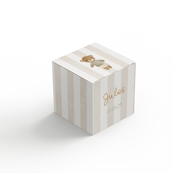 Een leuk doosje voor de doopsuikers met strepen en een lief knuffelbeertje. Het doosje is te bestellen in 2 formaten. We hebben een klein formaat, deze is 5 cm hoog breed en diep. Het grote formaat is 7 cm hoog, breed en diep. Allebei de formaten doosjes worden ongevouwen geleverd. De levertijd van de doosjes zijn 4 werkdagen.