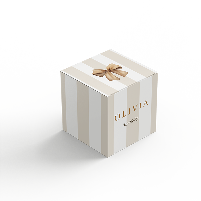 Een klassiek doosje voor de doopsuikers met strepen in beige en wit. De illustratie van het strikje maakt het helemaal af. Het doosje is te bestellen in 2 formaten. We hebben een klein formaat, deze is 5 cm hoog breed en diep. Het grote formaat is 7 cm hoog, breed en diep. Allebei de formaten doosjes worden ongevouwen geleverd. De levertijd van de doosjes zijn 4 werkdagen.