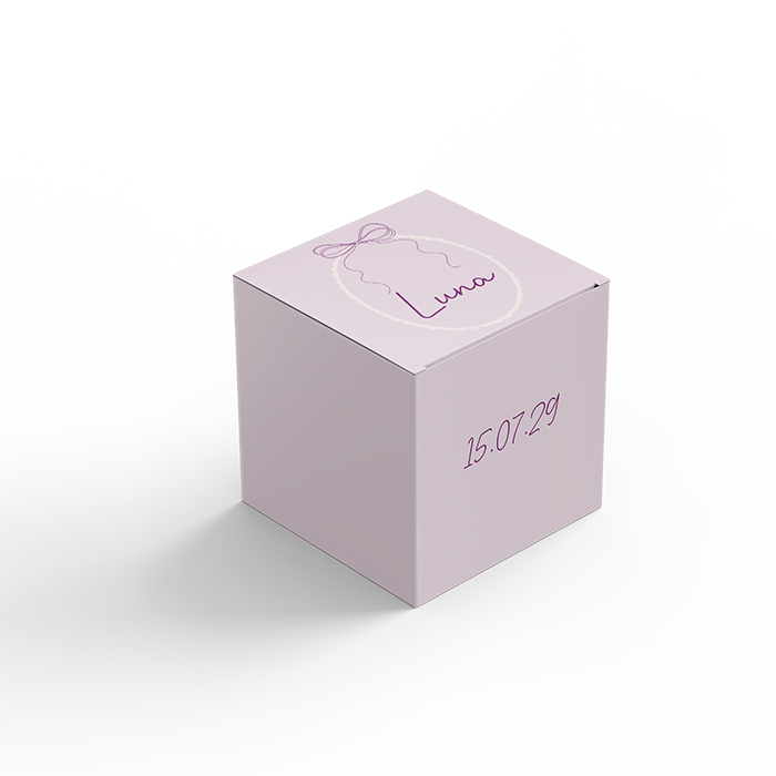Een mooi doosje voor de doopsuikers in lila en een ovaal met strik. Het doosje is te bestellen in 2 formaten. We hebben een klein formaat, deze is 5 cm hoog breed en diep. Het grote formaat is 7 cm hoog, breed en diep. Allebei de formaten doosjes worden ongevouwen geleverd. De levertijd van de doosjes zijn 4 werkdagen.| Totaalprijs: 0 |