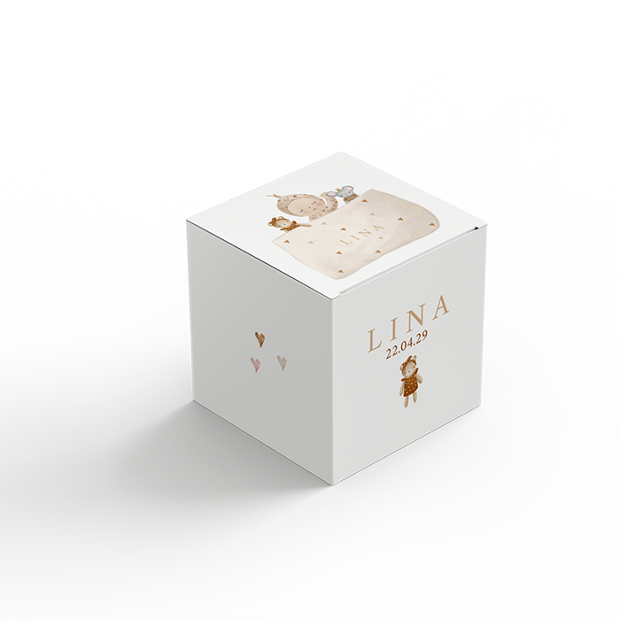 Een schattig doosje voor de doopsuikers met de illustratie van een slapende baby onder een hartjesdeken. Het doosje is te bestellen in 2 formaten. We hebben een klein formaat, deze is 5 cm hoog breed en diep. Het grote formaat is 7 cm hoog, breed en diep. Allebei de formaten doosjes worden ongevouwen geleverd. De levertijd van de doosjes zijn 4 werkdagen.