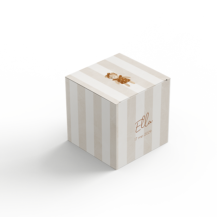 Een leuk doosje voor de doopsuikers met strepen en een lief knuffelbeertje. Het doosje is te bestellen in 2 formaten. We hebben een klein formaat, deze is 5 cm hoog breed en diep. Het grote formaat is 7 cm hoog, breed en diep. Allebei de formaten doosjes worden ongevouwen geleverd. De levertijd van de doosjes zijn 4 werkdagen.