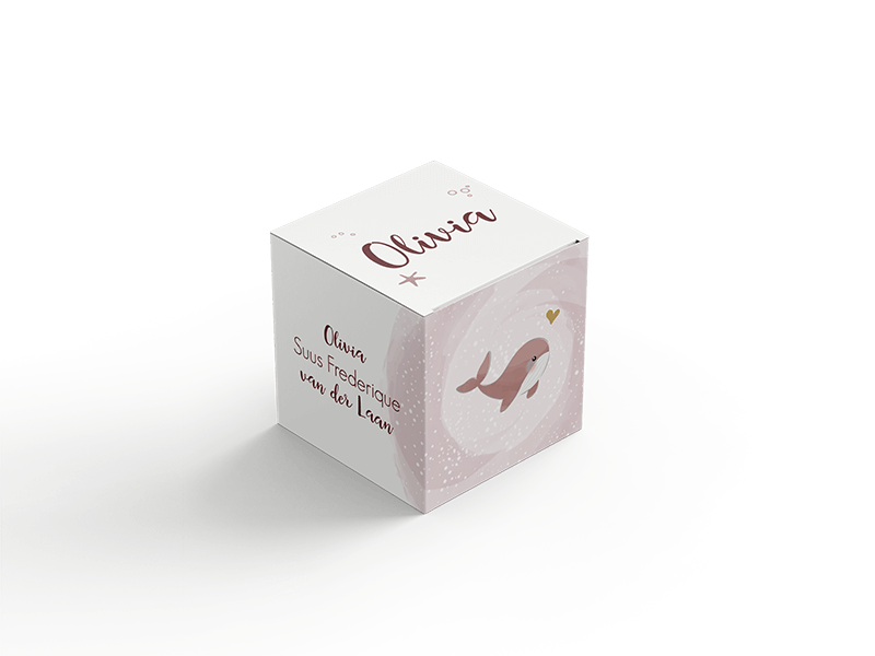 Doopsuikerdoosje in roze en wit met een walvisje in een zee van roze waterverf zwemt, het lieve hartje maakt het compleet!