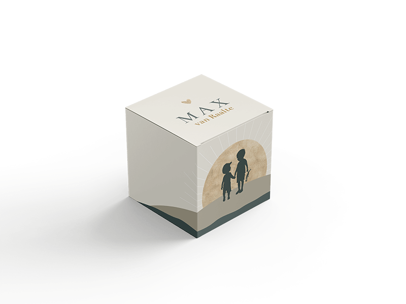 Doopsuikerdoosje met de silhouettekening van twee broertjes die hand in hand in een landschap wandelen met de zon als achtergrond. Het doosje is te bestellen in 2 formaten. We hebben een klein formaat, deze is 5 cm hoog breed en diep. Het grote formaat is 7 cm hoog, breed en diep. Allebei de formaten doosjes worden ongevouwen geleverd. De levertijd van de doosjes zijn 4 werkdagen.| Totaalprijs: 0 |