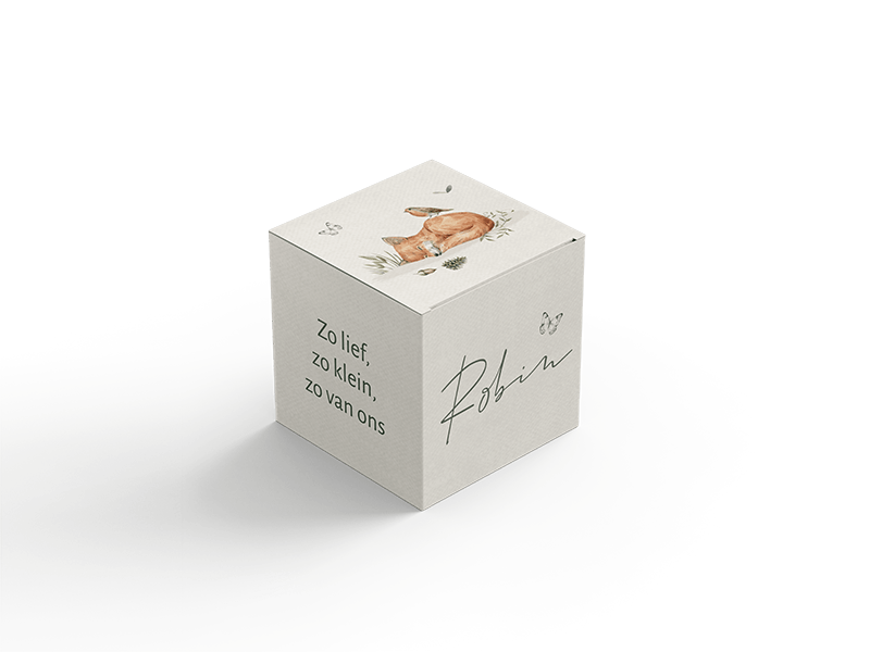 Schattig bijpassend doopsuikerdoosje bij het geboortekaartje met slapend vosje met vlinder en leuke typografie. Het doosje is te bestellen in 2 formaten. We hebben een klein formaat, deze is 5 cm hoog breed en diep. Het grote formaat is 7 cm hoog, breed en diep. Allebei de formaten doosjes worden ongevouwen geleverd. De levertijd van de doosjes zijn 4 werkdagen.