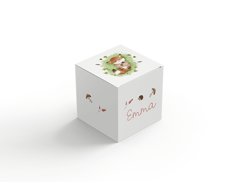 Doopsuikerdoosje met schattig vosje dat in het gras ligt in herfst thema. Het doopsuikerdoosje is voor een meisje. Het doosje is te bestellen in 2 formaten. We hebben een klein formaat, deze is 5 cm hoog breed en diep. Het grote formaat is 7 cm hoog, breed en diep. Allebei de formaten doosjes worden ongevouwen geleverd. De levertijd van de doosjes zijn 4 werkdagen.| Totaalprijs: 0 |