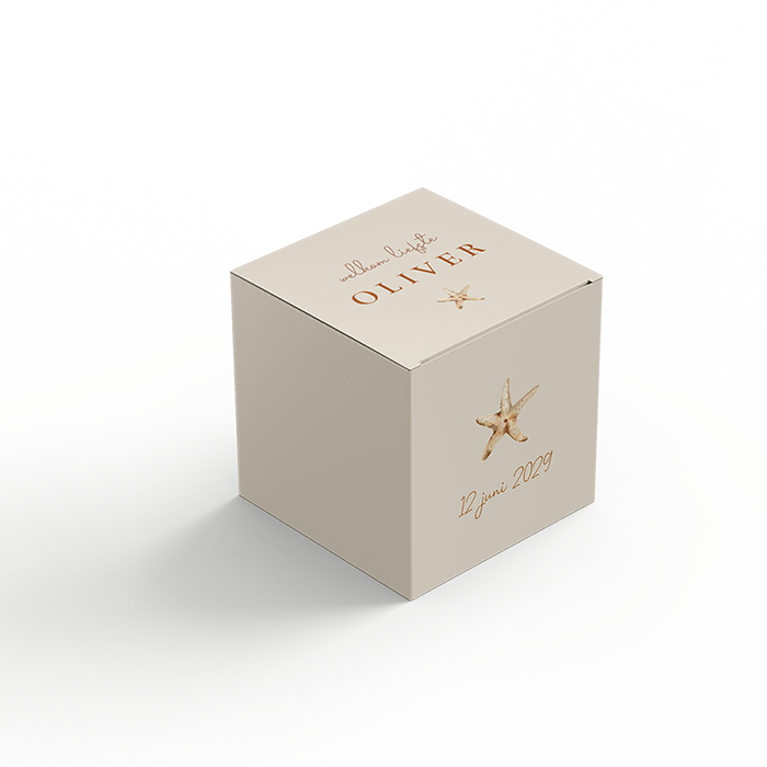 Een lief doosje voor de doopsuikers met de illustratie van een zeester. Het doosje is te bestellen in 2 formaten. We hebben een klein formaat, deze is 5 cm hoog breed en diep. Het grote formaat is 7 cm hoog, breed en diep. Allebei de formaten doosjes worden ongevouwen geleverd. De levertijd van de doosjes zijn 4 werkdagen.
